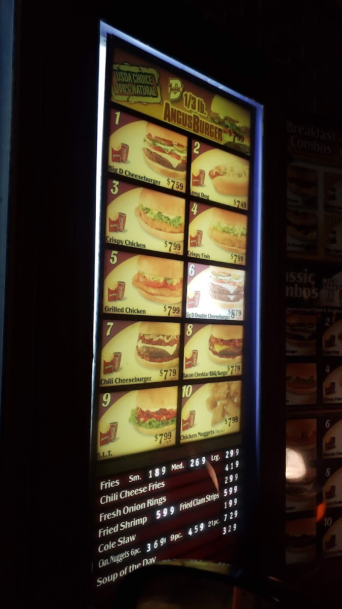 Morning visitors can enjoy classic breakfast options designed to start the day off right, with offerings like the Big D Breakfast that bring warmth and simplicity to the table. Later in the day, the menu shifts toward satisfying fast food staples—think juicy burgers, crispy fresh onion rings, and playful comfort items like tater tots or chili cheese dogs. For a quick snack or a family treat, choices such as chicken nuggets (including kid-friendly buffalo-style options) and frothy shakes provide casual bites that suit a friendly, relaxed setting.